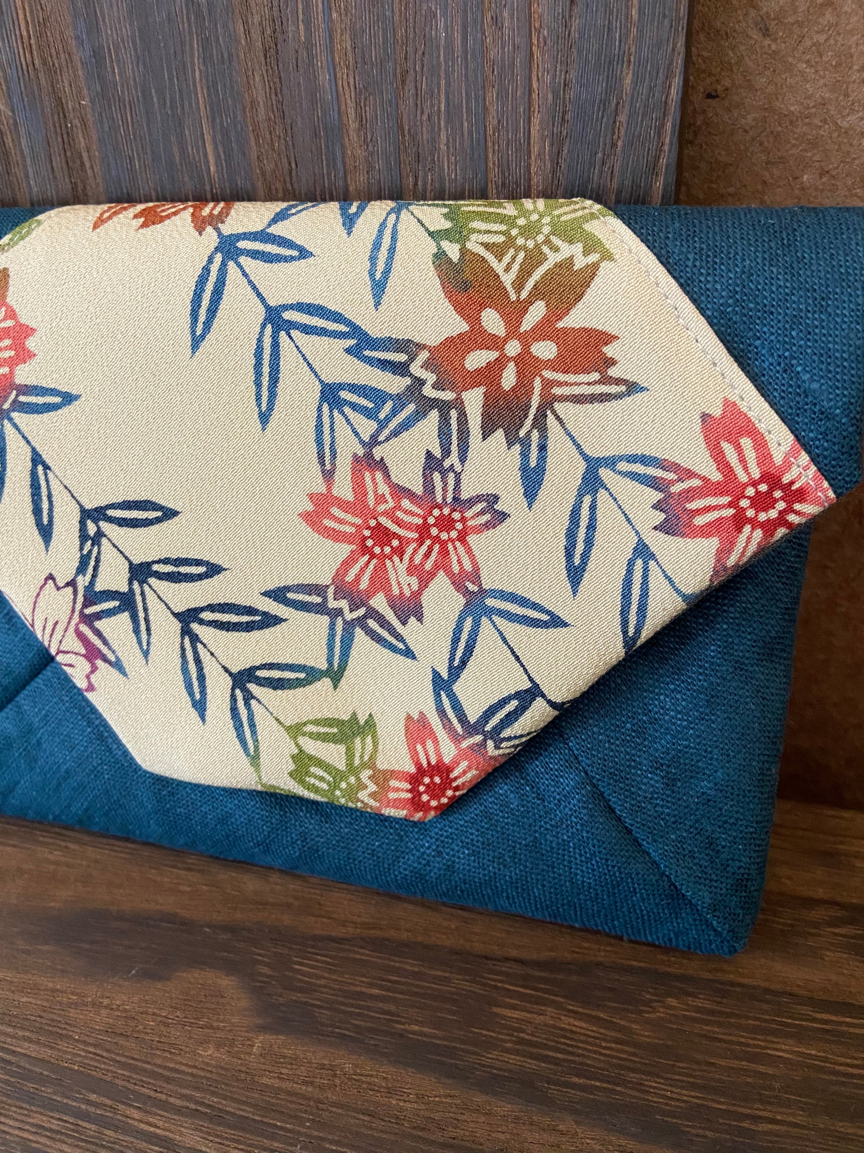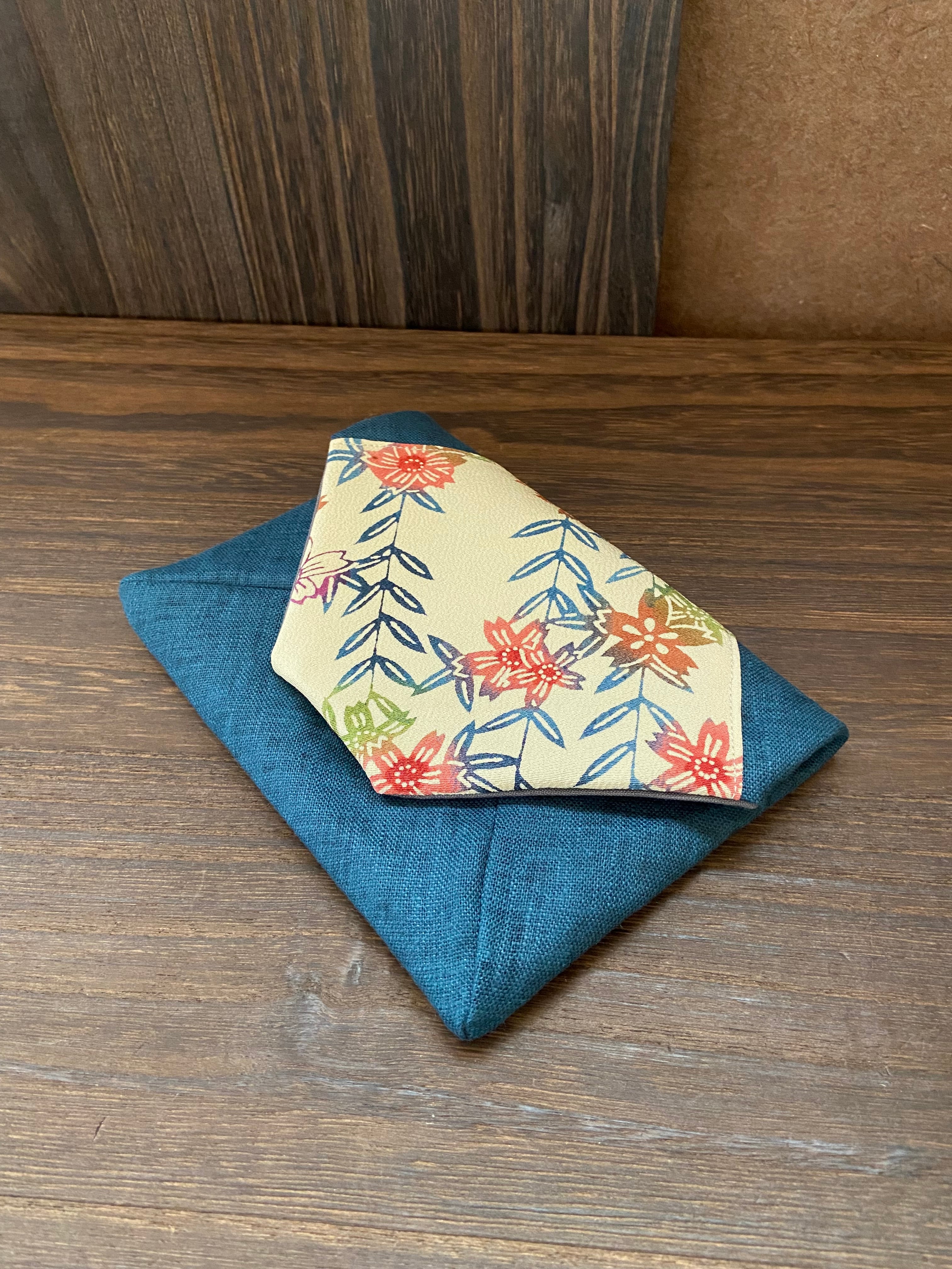 枝垂れ桜がデザインされた型染めの縮緬と深い海のようなブルーグリーンが素敵なリネンのツートンの数寄屋袋です。