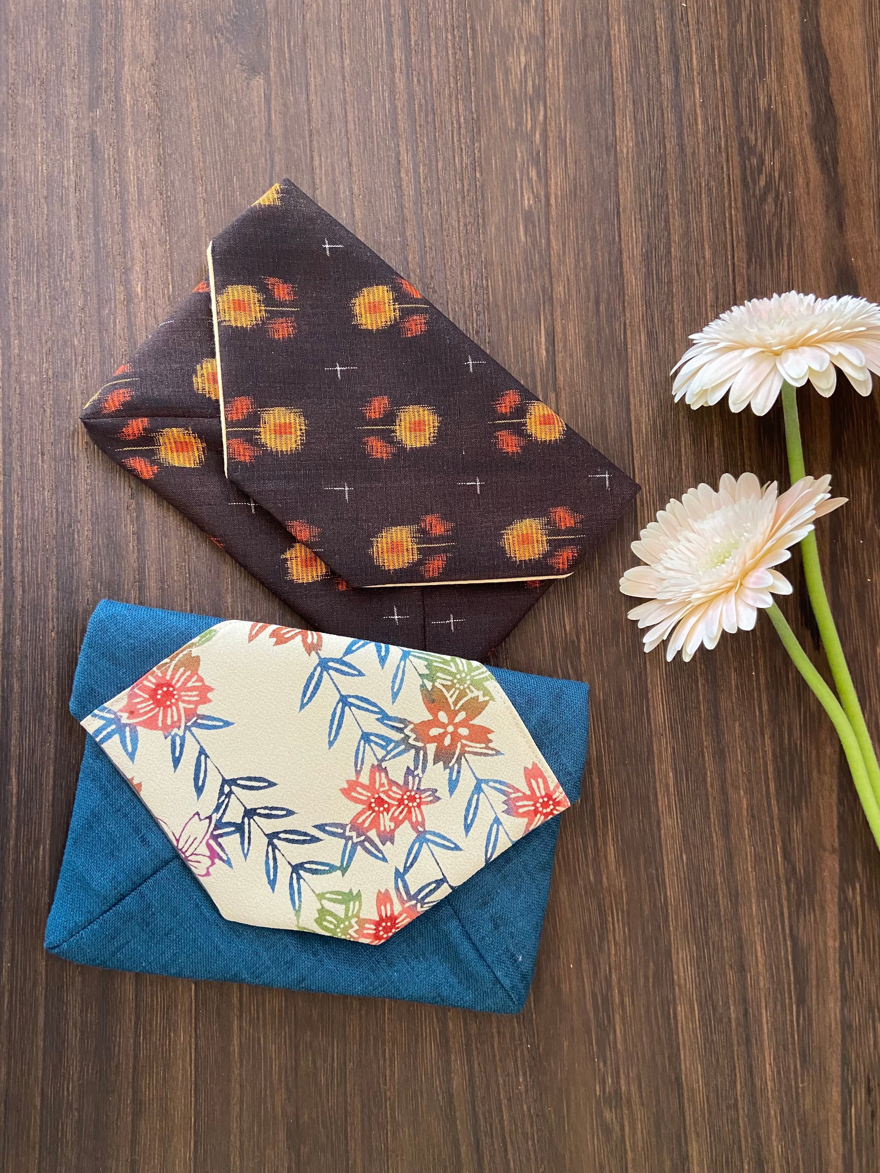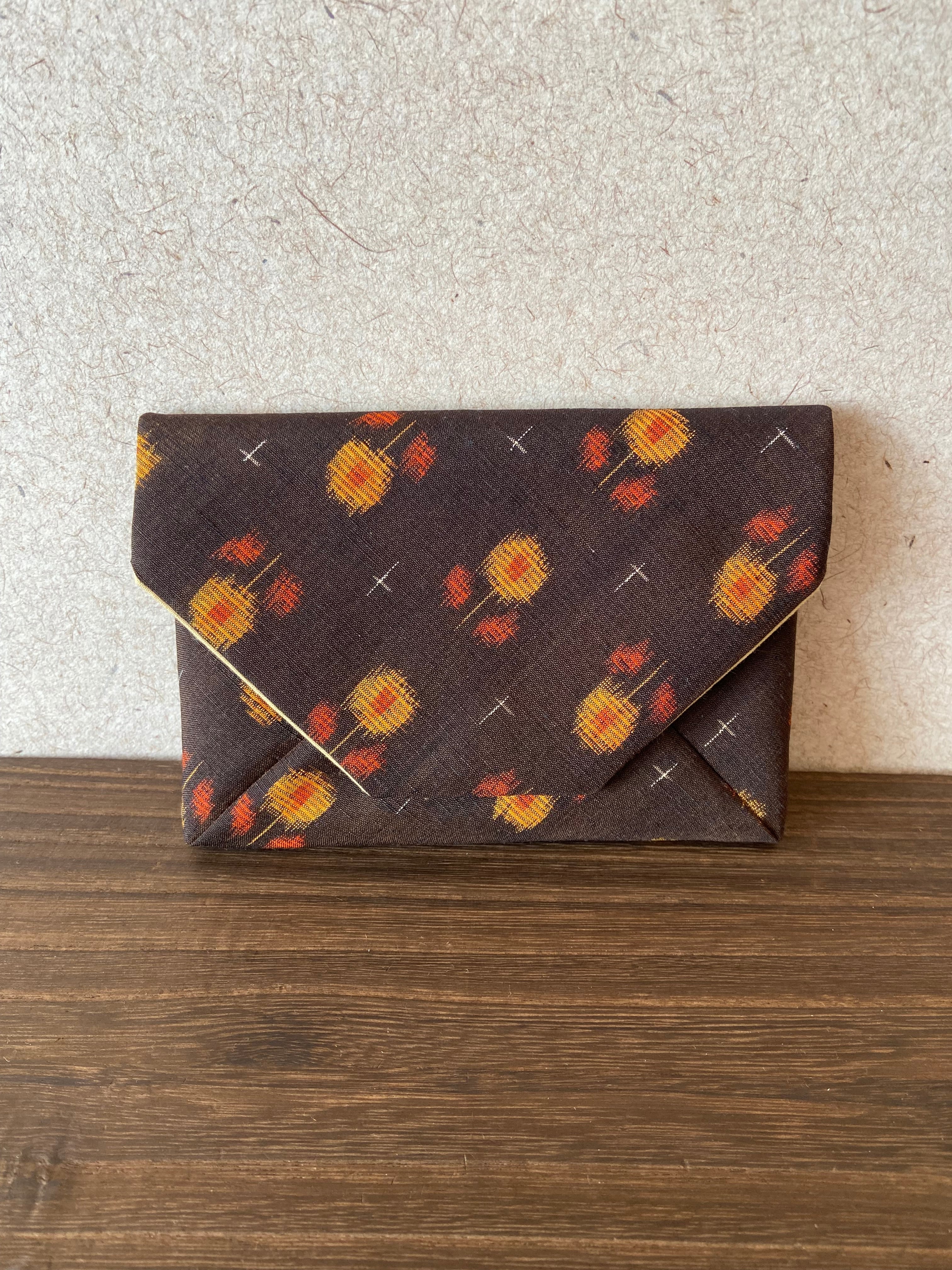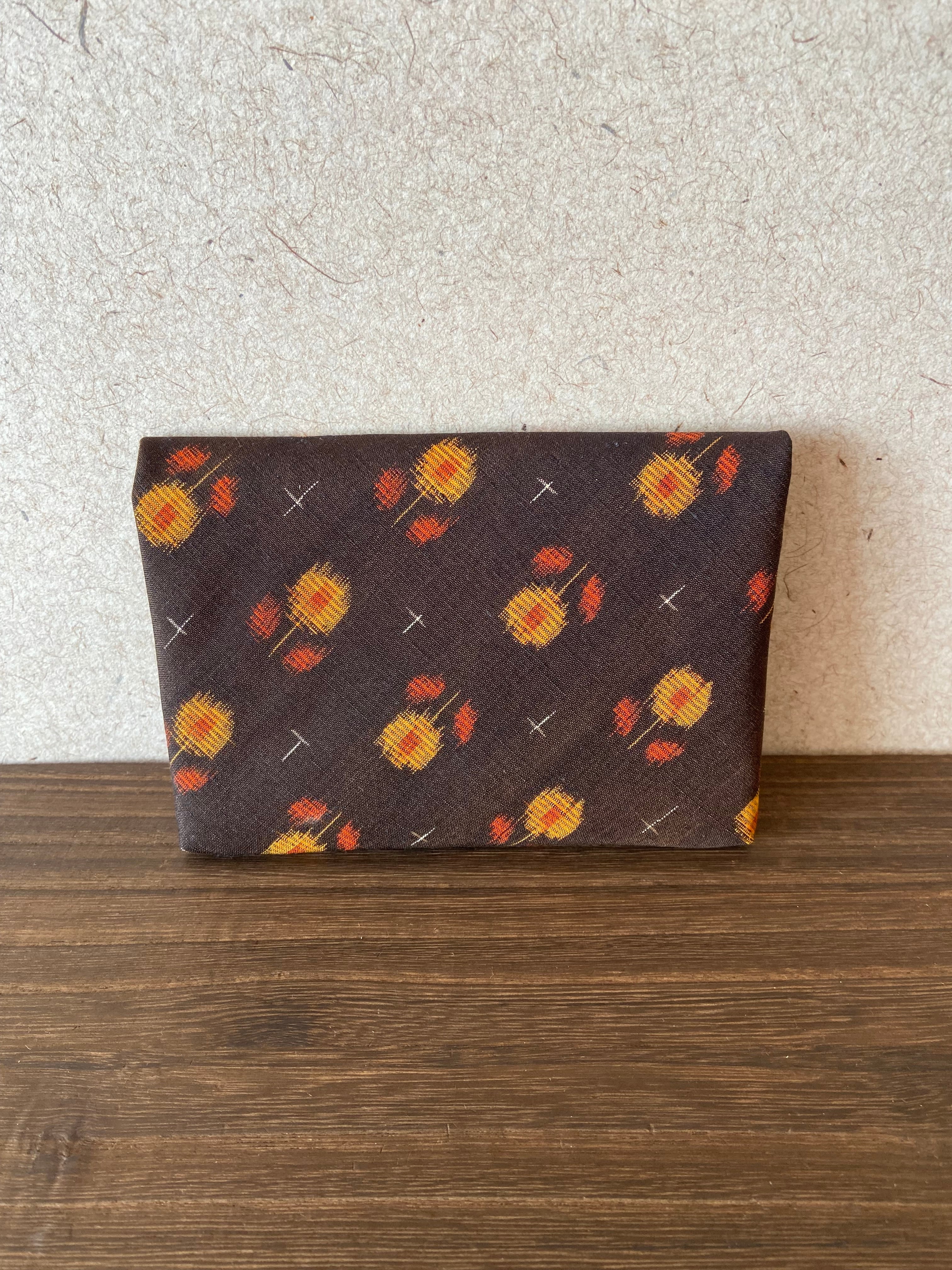 レトロなデザインの紬で織り出されたお花がキュートな数寄屋袋です。