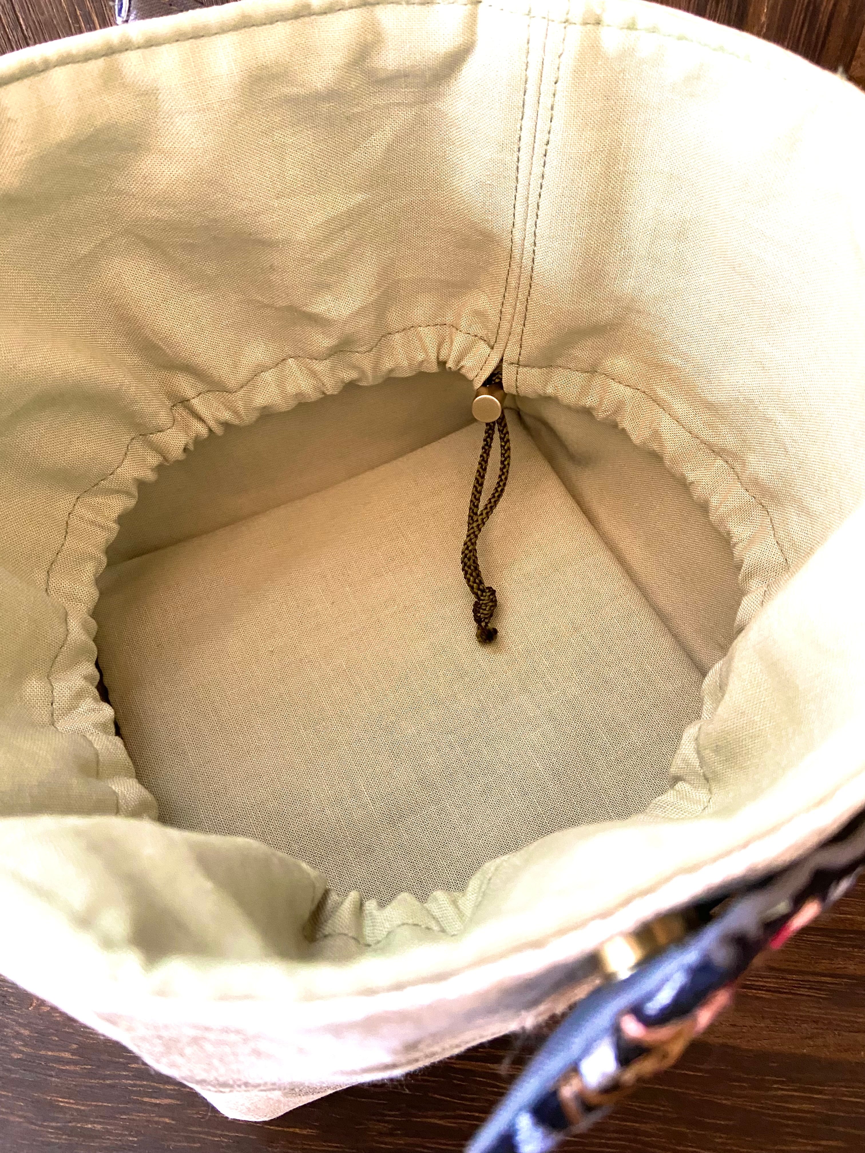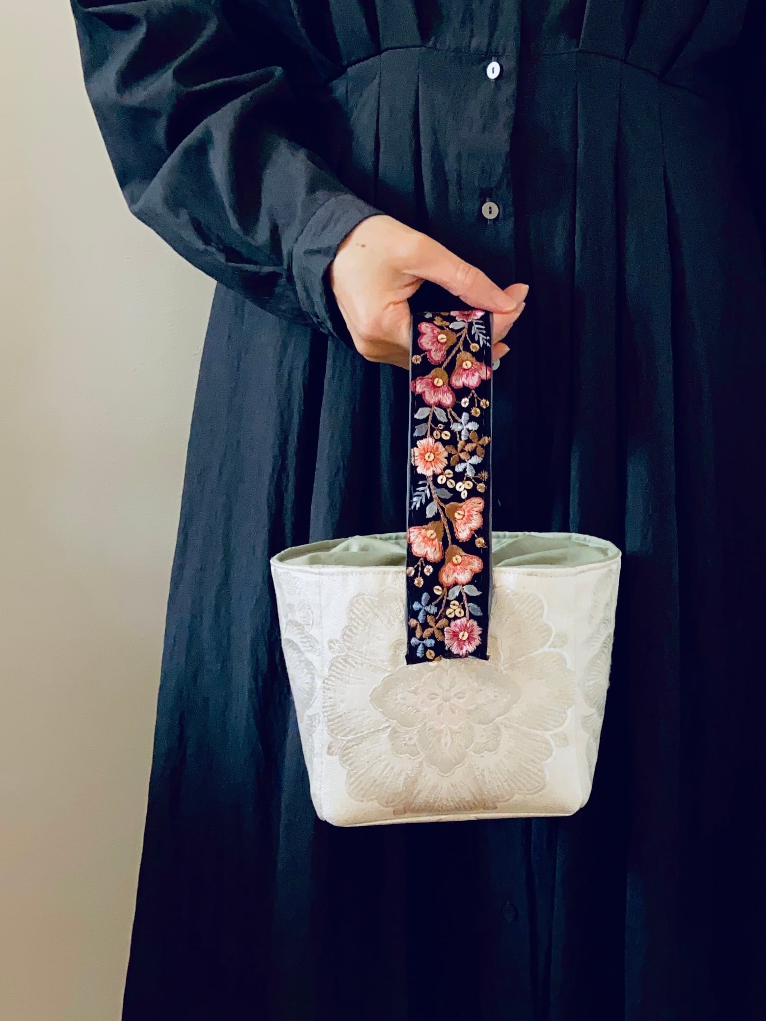 持ち手にはインドの刺繍リボンを、取り外しができるようにしました。
