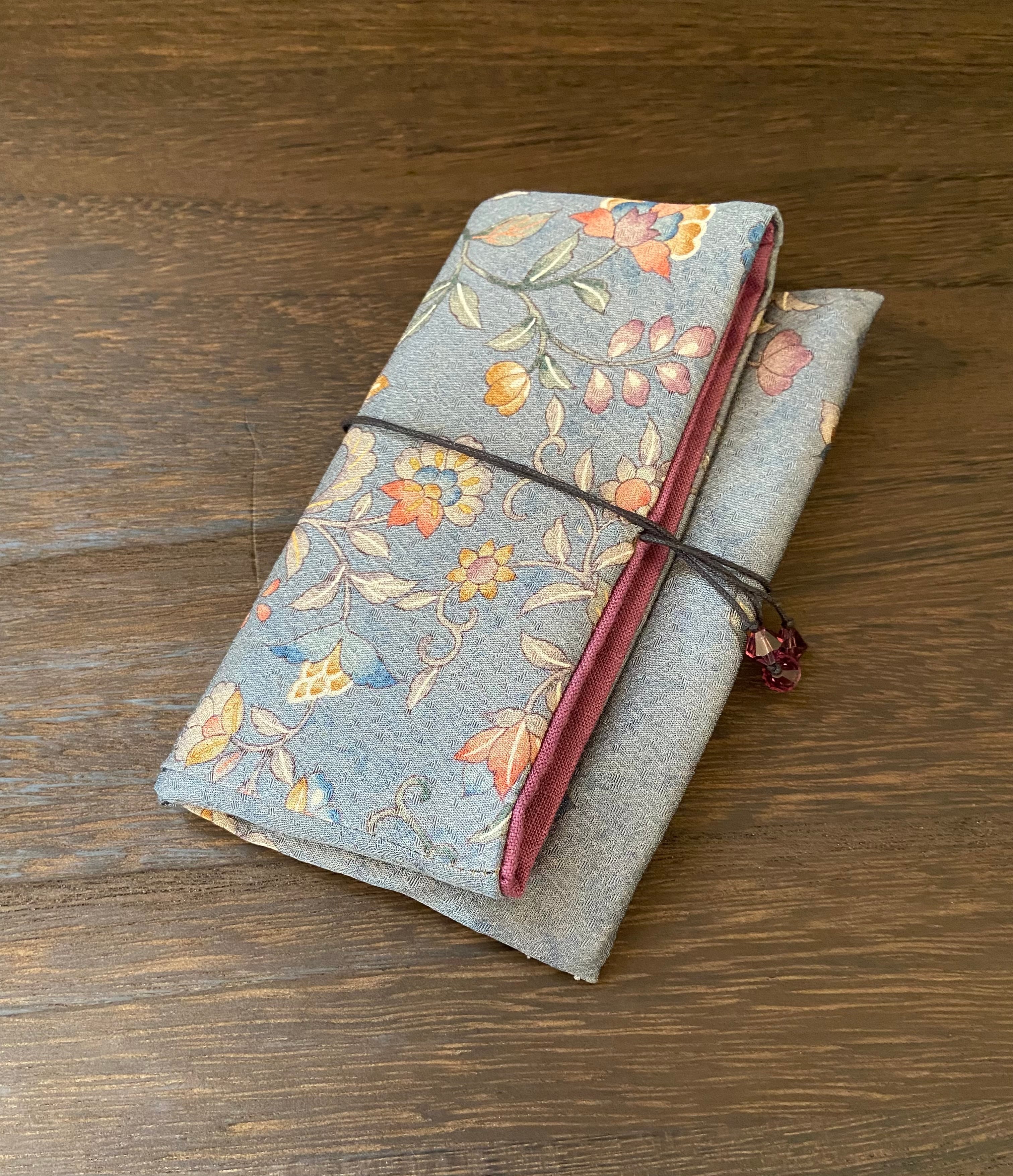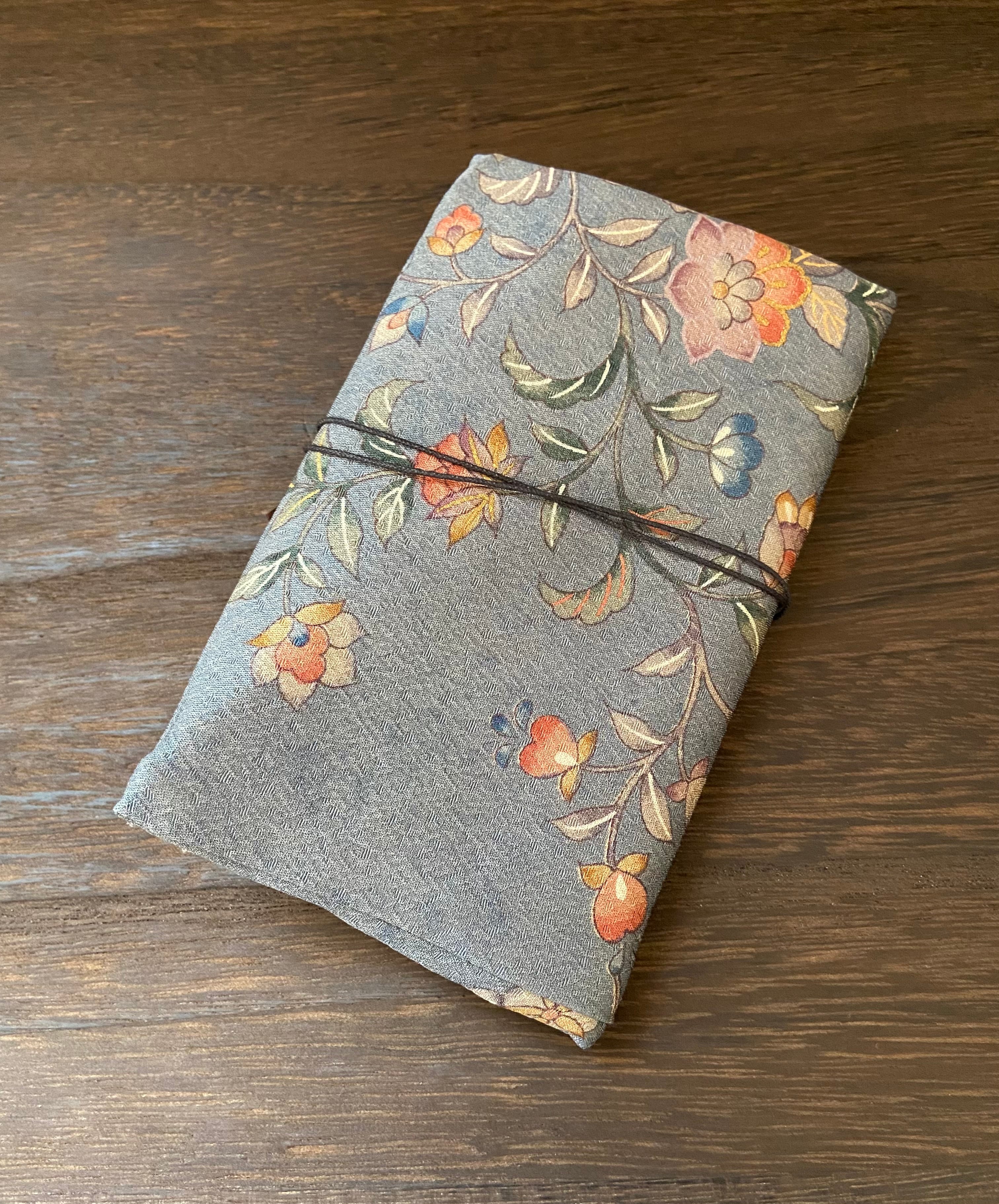 和更紗のような上品な柄が染められている光沢のある布地の小物入れです。