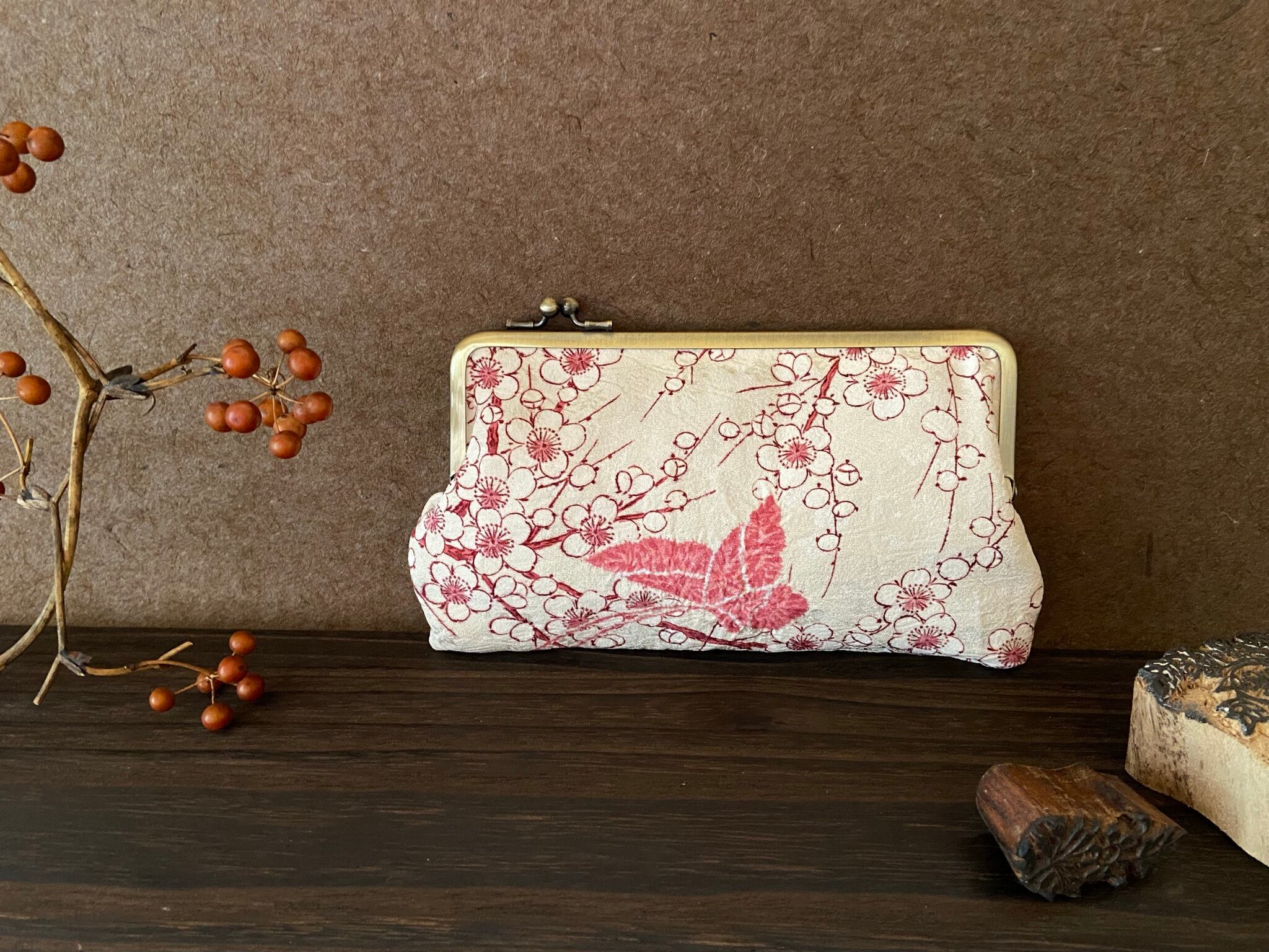 上品な少し光沢のあるアイボリーの地に、梅に遊ぶ蝶々が描かれている可憐なポーチです。
