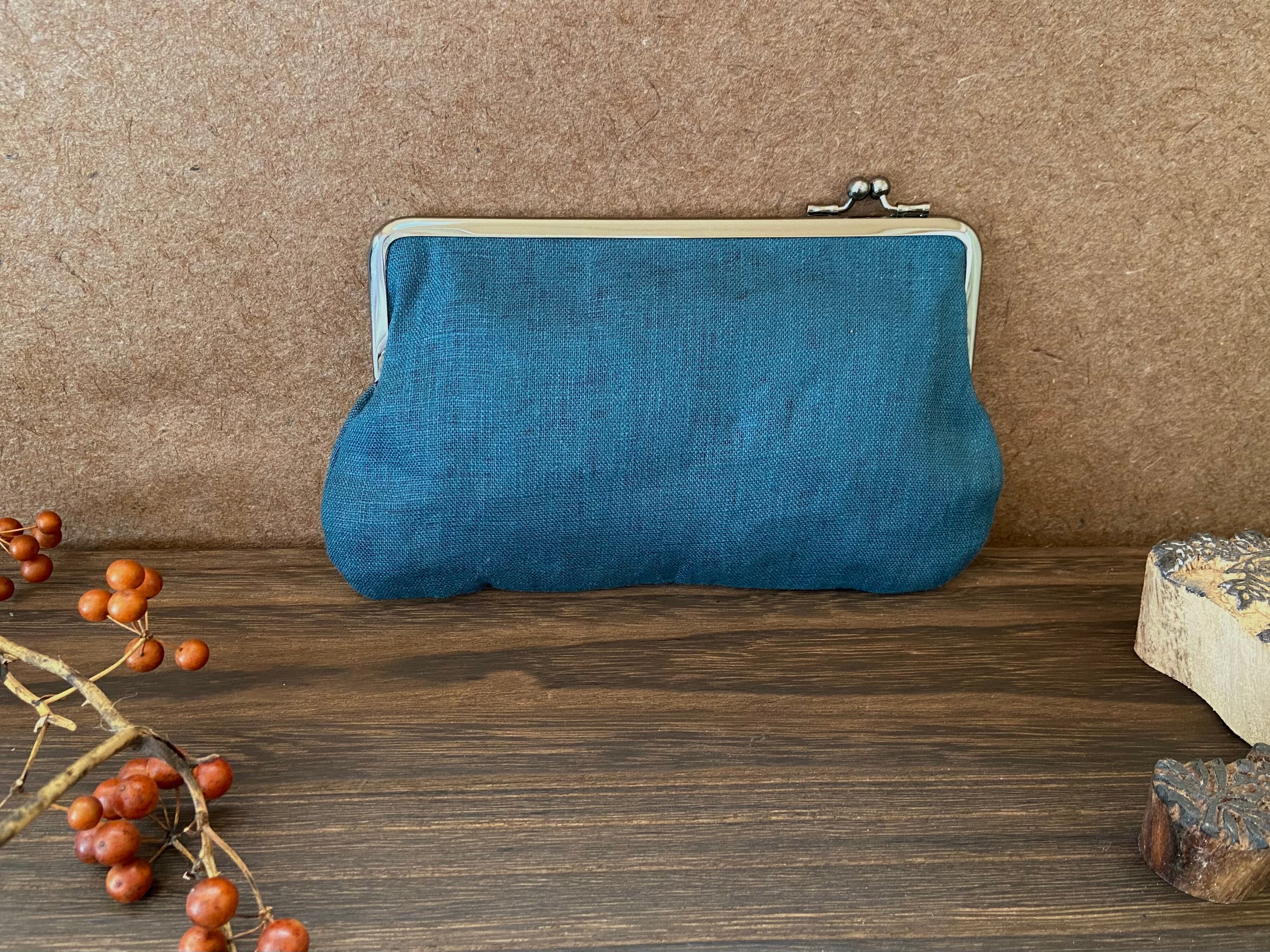 枝垂れ桜がデザインされた型染めの縮緬と深い海のようなブルーグリーンが素敵なリネンのツートンのポーチです。