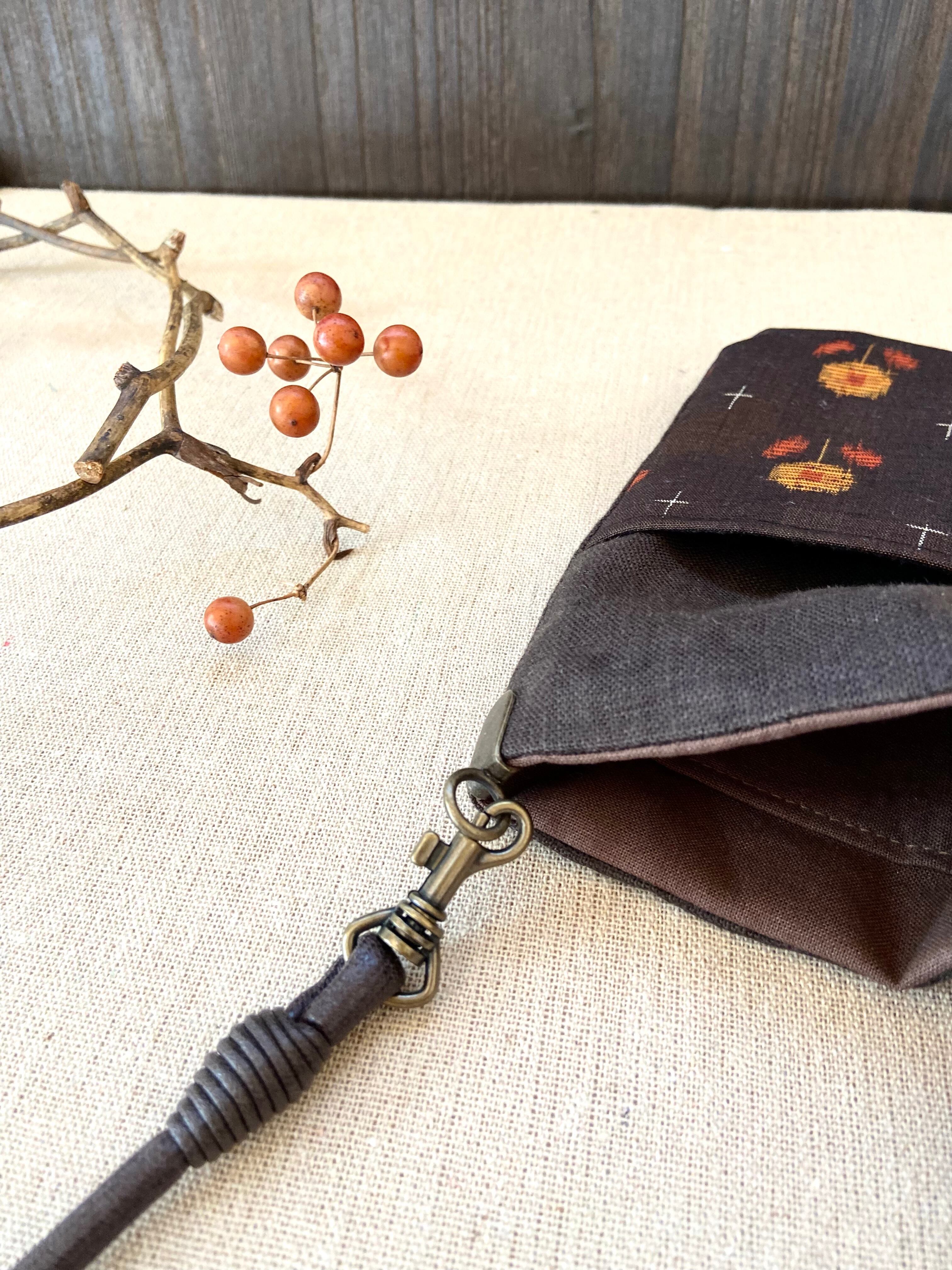表側には、レトロなデザインの紬で織り出されたお花がキュートな古布(正絹)を使用しています。その他は新品の上質なリネンを使用。内布は、新品のこげ茶色の綿になります。