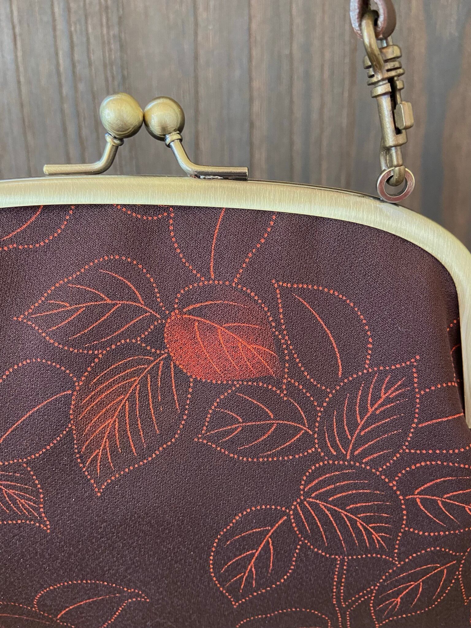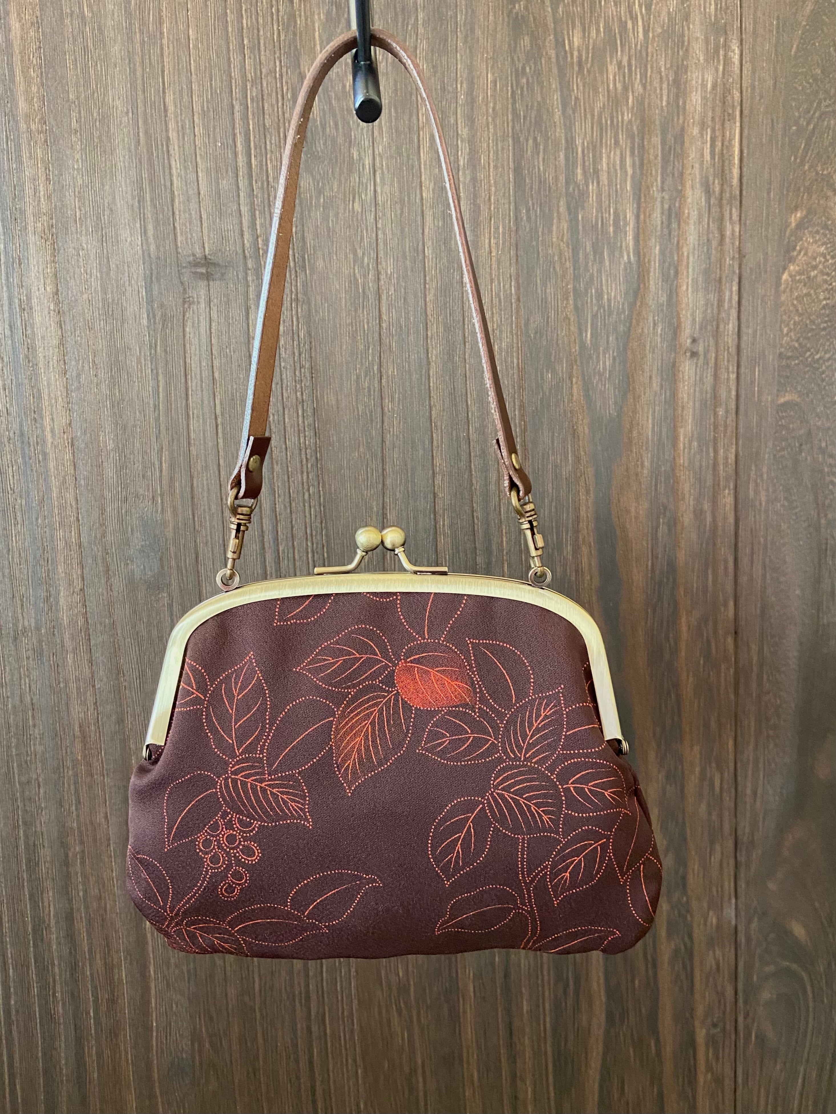 葡萄茶の地に繊細な点描で木ノ実が描かれているバッグです。