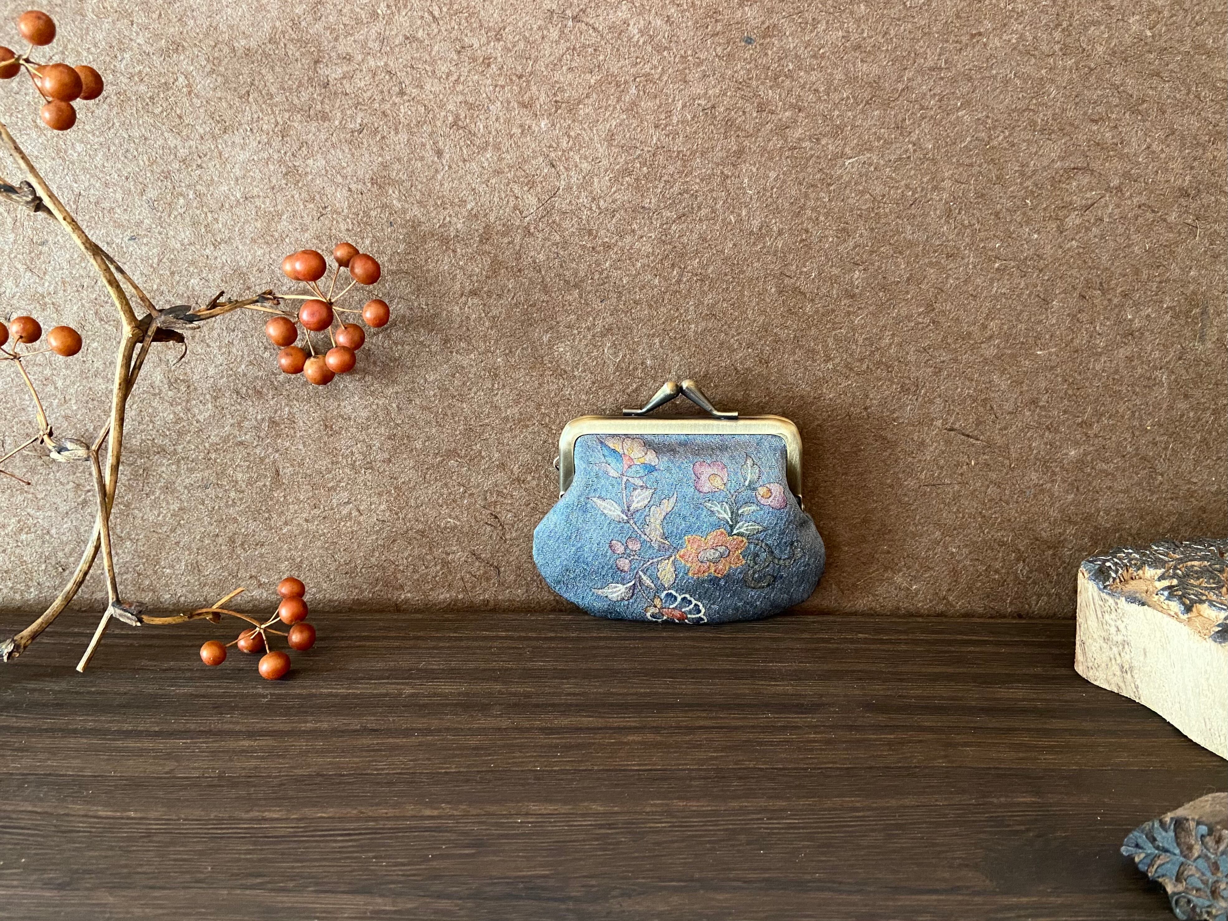 少し光沢のあるグレー地に、上品な更紗の花が描かれている小銭入れです。