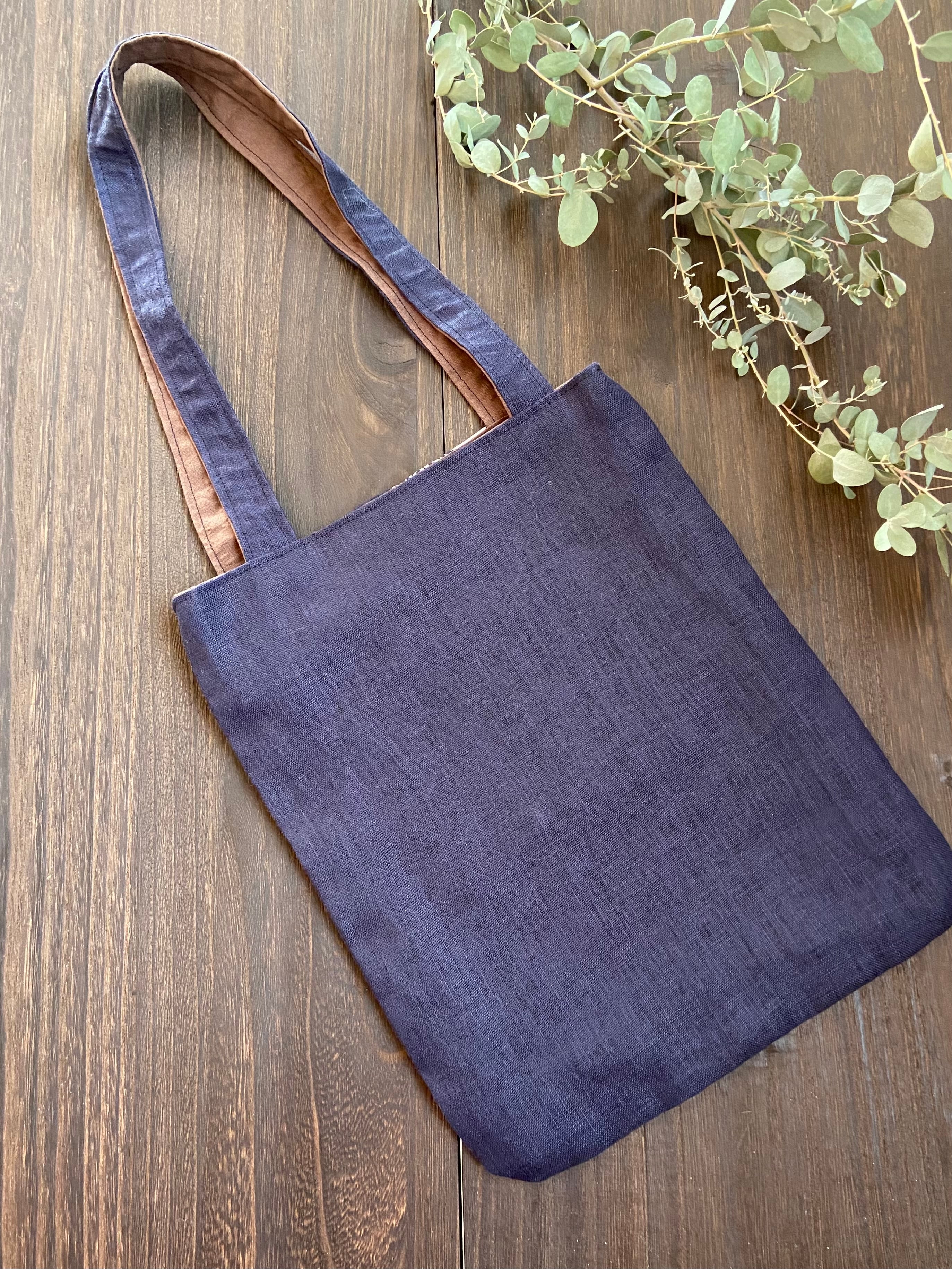 藍のグラデーションが印象的な幾何学の花が染められている古布と上質な紺色のリネンのツートンバッグ。涼やかな印象の素敵な意匠が目を引きます。